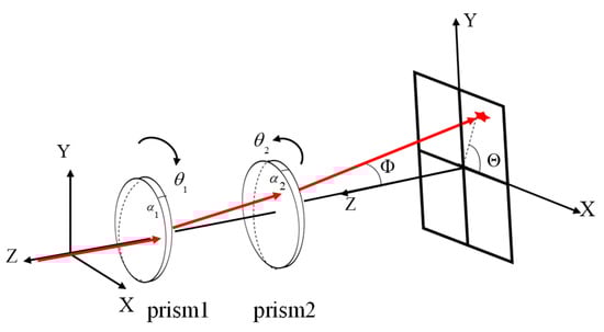 The Risley prism system consists of two coaxially aligned prisms. By adjusting the rotational angles of these prisms, the deflection angle of the refracted beam can be controlled. Using this principle, the Risley prism system can alter both the beam direction and the LOS orientation. The operational principle of beam deflection achieved through the Risley prism system is depicted in Figure 3. The system exhibits several notable advantages, including a compact structure, superior dynamic performance, and the capability to achieve large-aperture beam deflection over wide angular ranges. These attributes render it highly competitive compared to conventional electro-optical imaging and tracking devices, particularly in applications requiring lightweight and conformal designs for deployment on motion platforms [7,8,9]. In Figure 3, the red line represents the beam direction and the LOS orientation, and are apex angles of prism1 and prism 2, and are rotation angles of prism1 and prism 2, is azimuth angle of the refracted beam, and is pitch angle of the refracted beam. In the coordinate system of the Risley prism system, the Z-axis serves as the rotational axis, with prisms 1 and 2 rotating within the plane. The LOS direction does not lie within the same plane as the plane of prism rotation, which prevents the direct installation of the IMU on the Risley prism system for measuring variations in the LOS direction. Therefore, the IMU should be mounted on the motion platform to infer LOS changes indirectly.