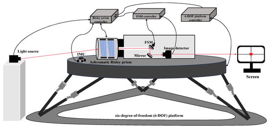 The proposed model of the Risley prism system on the motion platform is depicted in Figure 4. In this model, a light source simulates the target, while a six-degree-of-freedom (6-DOF) platform emulates the motion platform. An IMU installed on the motion platform measures its angular variations in inertial space in real-time. The Risley prism system is implemented as an achromatic Risley prism, and the model, along with the beam deflection calculation formulas, can be referenced in the relevant literature [26].