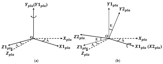 Rotation relationships of the motion platform coordinate axes. (a) Rotation of the motion platform around the azimuth axis. (b) Rotation of the motion platform around the pitch axis.