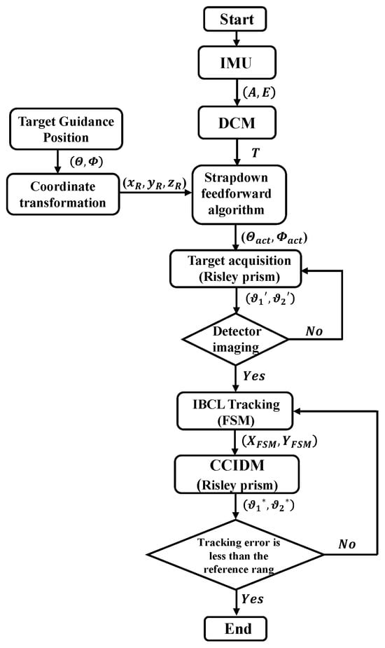 When the target enters the image detector’s field of view, IBCL tracking is initiated. First, the miss distance of image detector serves as the input for the FSM, and the FSM deflection angles are calculated to reduce the miss distance. Next, in the IBCLTCR-F system, the cascade control input decoupling method (CCIDM) [24] utilizes real-time FSM deflection angle feedback from its angle sensor as input to the Risley prism system during IBCL tracking. Finally, the rotation matrix error decoupling method [20] computes the Risley prism rotation angles , compensating for FSM deflection and ensuring that FSM deflection remains within operational limits. The miss distance on the image detector, representing the tracking error, is evaluated to determine whether it falls within the reference range. If the tracking error is within the range, the target tracking task is considered completed. Otherwise, if the error exceeds the range, the deflection angles of the FSM, and the rotation angles of the Risley prism are recalculated based on the miss distance. These three steps enable fast and high-precision target tracking in the Risley prism system on the motion platform.