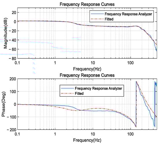 A frequency response analyzer generates a sine wave excitation signal with a 1°amplitude and a frequency range of 0.1–500 Hz, applied as input excitation for the Risley prism system. The analyzer’s two receiving channels collect both the excitation signal and the feedback signal from the Risley prism system’s encoder. From these signals, the frequency response curve of the system is obtained, and the fitted curve is used to derive the system’s servo transfer function. The frequency response curves are shown in Figure 10.