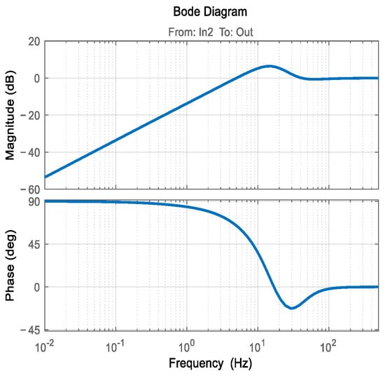 In this simulation model, In1 represents the desired input information of the Risley prism system on the motion platform, while Out denotes the output information of the Risley prism system on the motion platform. In2 serves as the disturbance input. The as the servo controller. The Fun 1 in Figure 11 corresponds to the strapdown LOS stabilization algorithm described in Section 2. The output of Fun 1 provides the rotation angle that compensates for the platform motion in the Risley prism system. In the absence of Fun 1, the rotation of the Risley prism system is solely determined by the rotation angle calculated from the original target guidance position. In such cases, platform motion will directly affect the LOS variation. With the inclusion of Fun 1, the rotation of the Risley prism is a combination of the rotation angle derived from the original target guidance position and the additional rotation angle due to the platform motion. The sum of these two components corresponds to in Figure 9, which helps mitigate the impact of platform attitude changes on the LOS. The simulation model calculates the Bode plot between In2 and Out, allowing for an analysis of the Risley prism system’s disturbance rejection capability at various frequencies. Figure 12 and Table 1 present the disturbance rejection Bode plot and the system’s disturbance rejection performance at different frequencies, respectively.