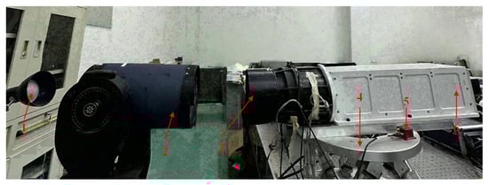 Figure 13 shows the experimental platform of the Risley prism system on the motion Platform. The experimental platform consists of a light source, a gimbal-mounted Meade telescope, an achromatic Risley prism, a 6-DOF platform, an IMU, and a detection system. The field of view of the achromatic Risley prism is . The 6-DOF platform simulates the motion platform and is controlled by computer software to move in both azimuth and pitch directions. The IMU, mounted on the 6-DOF platform, measures and calculates the real-time attitude variations in azimuth and pitch. In the experimental platform, the IMU adopts an optical fiber gyroscope, featuring a zero bias stability better than 0.05°/h, a maximum input rate of ±600°/s, a data update rate of 1000 Hz, and a random walk coefficient below 0.002°/. The attitude variation in the motion platform is obtained by integrating the angular velocity measured by the optical fiber gyroscope. To reduce the cumulative error caused by the zero drift characteristic of the optical fiber gyroscope during the integration process, a zero bias calibration was performed prior to the experiments.