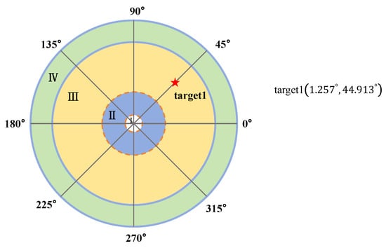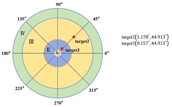 A static target is specified with an azimuth angle of 44.913° and a pitch angle of 1.257° in the polar coordinate system of the Risley prism. The target’s position within the system’s field of view is illustrated in the Figure 14. The field of view segmentation for the Risley prism system follows the methodology outlined in this paper [25].
