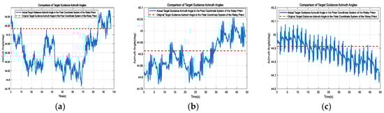 Comparison of the original and actual target guidance azimuth angles in the polar coordinate system of the Risley prism under three different 6-DOF platform motion trajectories. (a) First set. (b) Second set. (c) Third set.