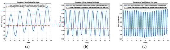 Comparison of the original and actual target guidance pitch angles in the polar coordinate system of the Risley prism under three different 6-DOF platform motion trajectories. (a) First set. (b) Second set. (c) Third set.