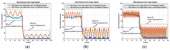 Comparison of miss distance of the image detector with and without LOS stabilization algorithm under three different 6-DOF platform motion trajectories. (a) First set. (b) Second set. (c) Third set.