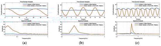 Time-domain and frequency-domain plots under three different 6-DOF platform motion trajectories. (a) First set. (b) Second set. (c) Third set.