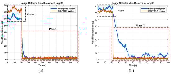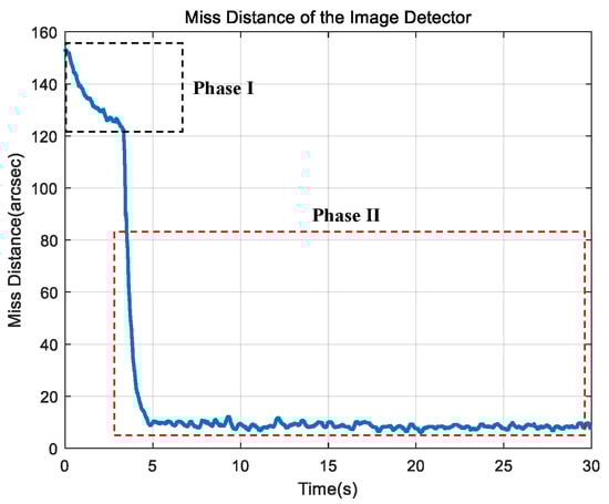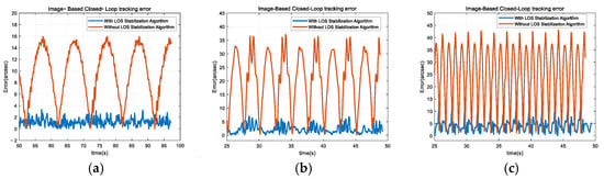 As shown in Figure 19, the application of the LOS stabilization algorithm during 6-DOF platform motion substantially mitigates the miss distance of the image detector during target acquisition, demonstrating the algorithm’s efficacy in achieving effective LOS stabilization. Furthermore, during the IBCL tracking process, the use of the LOS stabilization algorithm significantly reduces the tracking error.