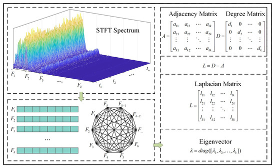 As illustrated in Figure 4, the vibration signal is first processed using STFT to produce a time-frequency spectrogram. Frequencies are treated as vertices, and a fully connected graph—referred to as the spatio-temporal graph—is constructed, with frequencies represented as . Subsequently, the adjacency matrix and degree matrix are computed to derive the graph Laplacian matrix . The eigenvectors of are then used as the features for each sample vertex .