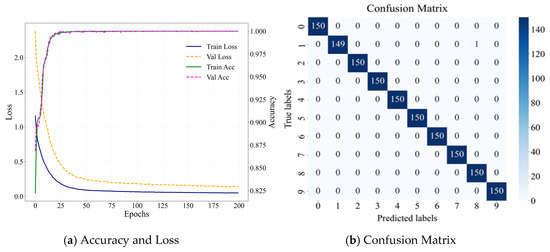 As shown in Figure 6a, the model converges within 30 epochs, achieving a classification accuracy of 99.93 ± 0.13%. Figure 6b presents the confusion matrix, illustrating the model’s predictions versus the actual classifications across different fault types. It is evident that only a few samples are misclassified, demonstrating the method’s excellent diagnostic performance.