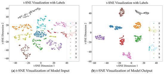 To visually analyze the role of the multi-metric hypergraph and the model’s classification performance, t-SNE is utilized to visualize the input hypergraph features and the model’s output features, as shown in Figure 7. In Figure 7a, the Laplacian matrix of the input hypergraph initially separates different vertices based on similarity relationships. After processing these vertices through the HGNN and applying two layers of hypergraph convolution, some previously dispersed samples are effectively distinguished according to their fault categories in Figure 7b. In this paper, Separability Score, average inter distance (avg_inter_dist), and average intra distance (avg_intra_dists) have been introduced as the evaluation of t-SNE. Among them, avg_inter_dist is the average distance between class centers, and the larger it is, the more obvious the interclass distinction. avg_intra_dists is the average distance from intraclass samples to class centers, and the smaller it is, the more obvious the class cohesion. Separability Score, on the other hand, is the avg_inter_dist/avg_intra_dists; the higher the score, the higher the cohesion and the lower the coupling.