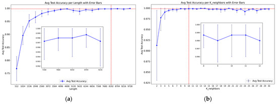 In Figure 7, 0–9 on the right side indicate the different labels provided for categorization. Before the model computation, i.e., in Figure 7a, avg_inter_dist is 46.5396, avg_intra dists is 10.5410, and Separability Score is 4.4151. After computation by the hypergraph neural network model proposed in this paper, the avg_inter_dist is 52.3662 and the avg_intra_dists is 5.2327. The Separability Score is 10.0075, which is comprehensively better than the results without vertex processing and hypergraph convolution. Additionally, the diagnostic performance of the proposed method is significantly influenced by two key parameters: the vertex length in hypergraph construction and the number of associated vertices . The vertex length determines the amount of fault information encapsulated within each vertex, thus affecting the similarity measurement between samples. The number of associated vertices dictates the size of each hyperedge, thereby influencing the relationships between vertices.