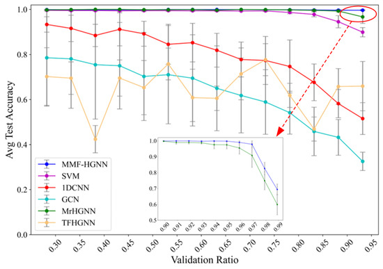All methods were evaluated using the same experimental setup to ensure a fair comparison. The results of these comparisons are presented in Figure 10. To validate the performance of MMF-HGNN and MrHGNN with a minimal number of labeled samples, the training sample ratio was varied from 0.10 to 0.01. As shown in the inner figure from Figure 10, MMF-HGNN consistently demonstrates superior classification accuracy compared to MrHGNN across all sample ratios. Even with an extremely limited labeled sample ratio of 3%, MMF-HGNN maintains a high average classification performance of 0.978 ± 0.026.