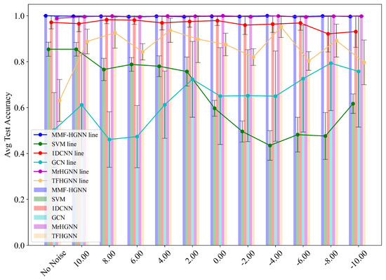 The classification accuracy of all methods decreases to different degrees as the SNR decreases. However, compared with other methods, MMF-HGNN maintains a more stable classification effect at lower SNR values. When SNR = 5 dB, the classification accuracy of MMF-HGNN decreases only slightly, outperforming the other compared methods. When SNR ≥ 20 dB, the classification accuracy of MMF-HGNN is still higher than other methods, indicating that the diagnostic performance of MMF-HGNN is minimally affected by the additional WGN. In noisy environments, MMF-HGNN suffers less noise interference than other methods and has strong noise robustness.