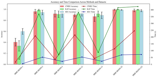 In Figure 12, the accuracy and time performance of different methods on various datasets have been compared. The datasets are labeled as MMF-HGNN from single metrics like 1, 2, and 3 to three metrics like 123. The accuracy is represented by bars in three colors: red for CWRU dataset Accuracy, green for KAT dataset Accuracy, and blue for SEU dataset Accuracy. The time cost by each method is shown by a darker lines, and error bars indicate the variability in accuracy measurements.