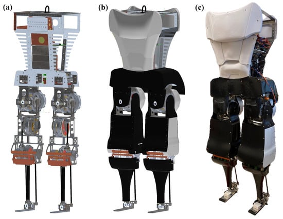 Mithra humanoid robot platform. (a) A 3D CAD model of mechanical structure; (b) a 3D CAD model with covers; and (c) the final manufactured version.