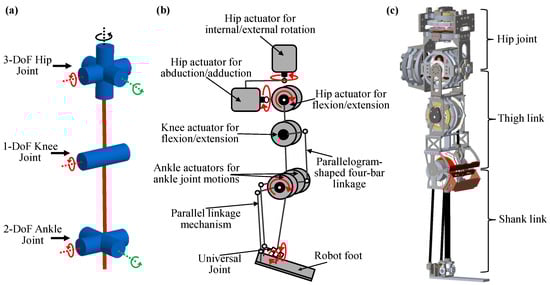 To accurately achieve human-like movements, it is essential to consider several key factors, one of the most important being the degrees of freedom. While the human leg possesses numerous DoFs, its primary kinematic characteristics can be effectively captured using six DoFs with sufficient accuracy: three at the hip, one at the knee, and two at the ankle []. Mithra adopts this fundamental kinematic structure, which is also employed by many well-known humanoid robots such as ASIMO [], HUBO [], and TALOS [], as illustrated in Figure 2a. This six-DoF configuration not only captures essential leg dynamics, but also enables a closed-form solution for inverse kinematics, simplifying control and motion planning [].