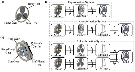 Joint actuation system of Mithra. (a) Standard planetary gearbox; (b) compound planetary gearbox; and (c) actuation system configuration for each joint.