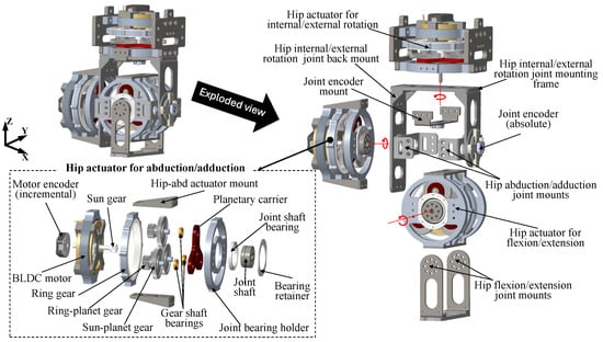 The 3D CAD model of Mithra’s hip joints is shown in Figure 4. Each actuator assembly consists of a brushless direct-current (BLDC) motor paired with a compound planetary gearbox. In the exploded view of the abduction/adduction hip actuator, one end of the motor’s rotor is connected to an incremental encoder, while the other end is coupled to the sun gear of the gearbox. The gearbox contains three planetary gear sets, each comprising a sun–planet gear and a ring–planet gear. The gear wheels for each part of these gearboxes were selected using the optimization framework detailed in [,]), ensuring that they withstand the worst-case loading conditions. This was accomplished through constraining the nominal tangential load on the pitch circle of each gear to be below the allowable tangential load calculated using the AGMA bending stress equation []. Considering the uncertain nature of impact loads in dynamic robotic locomotion and the critical importance of maintaining a lightweight design, a factor of safety (FoS) of 2 was applied to all gear wheels during the optimization process. All three hip gearboxes utilize a transmission ratio of 15:1. The gear wheels were purchased off-the-shelf to minimize manufacturing time and cost. However, modifications were made to reduce the weight and moment of inertia of the gears, maintaining the minimum FoS at 2. The cylindrical shaft, which is connected to the planetary carrier, serves as the joint’s output shaft and is supported by a roller bearing embedded in a bearing holder (Figure 4).
