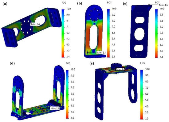 FEA results of structural components in the hip actuation system. (a) Hip abduction/adduction joint mount; (b) hip flexion/extension joint mount; (c) hip internal/external rotation joint back mount; (d) hip flexion/extension joint mounting frame; and (e) hip internal/external rotation joint mounting frame.