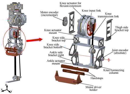 To preserve the desired thigh length, two knee side brackets (top and bottom) were designed as shown in Figure 6. The axis of rotation for the knee joint is defined by the connection axis between the bottom knee bracket and the ankle side bracket. Mechanical hard stops were integrated between the left and right knee bottom brackets and the ankle bracket to prevent hyperextension of the knee joint during motion (Figure 6). These stops also help to avoid singular configurations in the linkage, where the input and transmission links become colinear, potentially causing control instability and a loss of mechanical advantage. At the contact surfaces of the hard stops, polymer strips made from D3O, an impact-absorbing material, were used to mitigate impact forces, reduce post-impact vibration, and protect structural components from damage under high-shock conditions.
