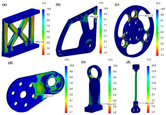 FEA results of structural components in the knee actuation system. (a) Knee side bracket top; (b) knee side bracket bottom; (c) knee planetary carrier; (d) knee input link; (e) knee connecting column; and (f) knee transmission link assembly.