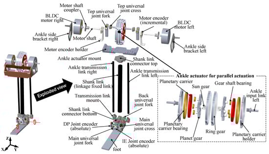 Each gearbox output connects to the foot through a transmission link and two universal joints, i.e., top and back (see Figure 8), enabling the ankle joint to achieve two degrees of freedom (2-DoF) motion at the main universal joint located on the foot. The dorsi/plantarflexion motions are achieved by rotating both planetary carriers of the ankle gearboxes in the same direction at the same speed. In contrast, inversion/eversion motions are realized by driving the planetary carriers in opposite directions. With this coupled actuation scheme, the ankle joint can deliver twice the torque of a single actuation setup (comprising a motor, gearbox, and single 4-bar linkage) while retaining its output speed. In other words, this configuration allows the ankle to perform high-torque operations at high joint speeds. The ankle actuator differs from the hip and knee actuators, since it employs an outrunner-type BLDC motor paired with a single-stage planetary gearbox. As shown in Figure 8, the ankle motor is mounted on the ankle side bracket, and its motor shaft is attached via a shaft coupler. The shaft passes through a high-resolution incremental encoder for motor position and velocity measurements, and a sun gear is mounted at the end of the shaft.