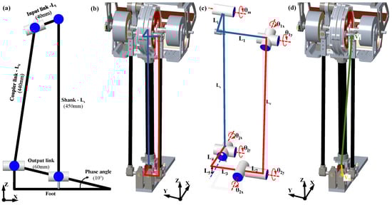The parallel four-bar linkage mechanism of the ankle actuation requires a closed-form inverse kinematics solution for several reasons, including accurate ankle control, force analysis for structural component design, and determining motor positions at robot startup using feedback from joint encoders. In the inverse kinematics calculation of the ankle, two distinct kinematic chains were defined between the two universal joints located at the end of the shank and the ankle input link. One chain passes through the shank link (highlighted in blue in Figure 9b), while the other passes through the ankle transmission link (highlighted in red). These two kinematic chains are further illustrated on a simplified 3D schematic shown in Figure 9c.