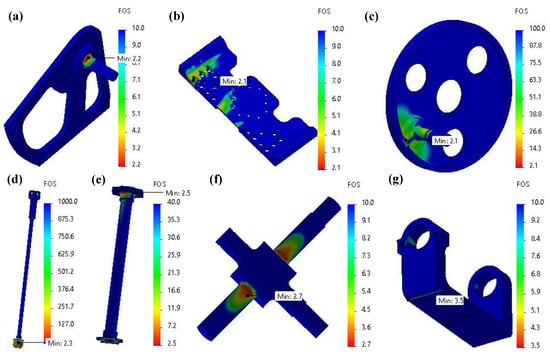 Figure 10d presents the FEA results for the ankle transmission link assembly under the maximum loading conditions. The final design achieved a minimum FoS of 2.3. Given the importance of link length to joint position and power transmission, deflection analysis was also performed. The link was found to deflect only 0.0018 mm at maximum load, which is negligible and does not compromise actuator performance. A higher safety factor was required for components closer to the foot due to the increased impacts experienced at the distal end of the leg. To address this, a minimum FoS of 2.5 was targeted for all foot-level structural components. Figure 10e–g present the FEA results for the final design versions of the shank assembly, main universal joint cross, and the joint fork located below the knee, respectively. All components met or exceeded the FoS threshold of 2.5, ensuring structural integrity, resistance to deformation, and protection against buckling under the maximum dynamic loads. During both piecewise and assembly-level FEA, we aimed to replicate real-world conditions as accurately as possible. For example, in the case of the main universal joint, fixtures were defined to simulate proper support at the roller bearing connections, along with directional fixtures to represent the placement of snap rings that fix the component both radially and axially.