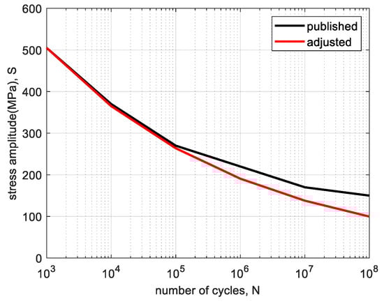 From the published data for the S–N curve of Al7075-T6 [,], it is observed that the high-cycle fatigue domain extends from to cycles, with the maximum fatigue strength reaching approximately 150 MPa. To construct an adjusted S–N curve suitable for our customized structural components, we considered the ultimate tensile strength of the material as the reference point at the onset of the high-cycle fatigue domain ( cycles) and adjusted endurance limit at the cycles. The adjusted S–N curve for Al7075-T6, used in our fatigue analysis, is presented in Figure 11. This curve was derived using the following empirical equation provided in []: