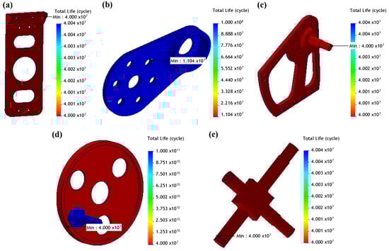 Fatigue analysis results of the structural components. (a) Hip internal/external rotation joint back mount, (b) knee input link, (c) ankle side bracket, (d) ankle planetary carrier assembly, and (e) universal joint cross.