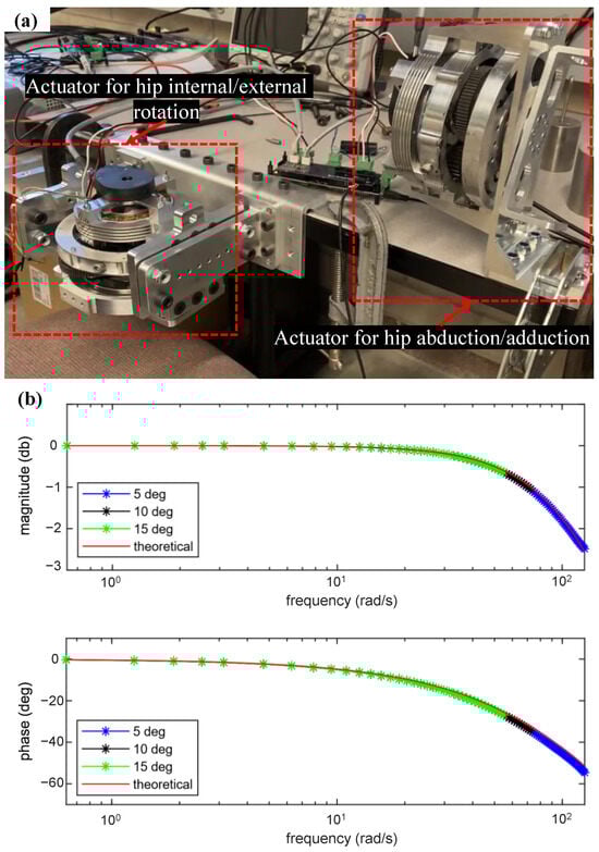 where is 76.4 Nm/rad, is 0.64 Nm.s/rad, and J and B are the inertia and damping of the chosen actuator with the values of 0.0007958 kg.m2 and 0.001 Nm.s/rad, respectively. Figure 13b depicts the bode plot containing both theoretical and experimental results. The plots of both experimental and theoretical results indicate that the actuator system exhibits the characteristics of a first-order linear system. In all three cases of sinusoidal position commands, the actuator did not reach the cutoff frequency (3 dB below the low-frequency magnitude), as the experiment had to be stopped before reaching this frequency for the aforementioned reasons. This was due to the fact that the dynamic response of the actuators is so fast that its cutoff frequency is above the practical operation range.
