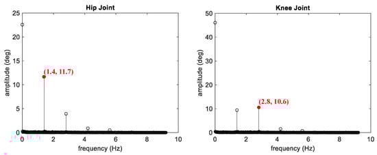 Frequency spectrum of joint trajectories for hip and knee during a human running scenario at 3 m/s.