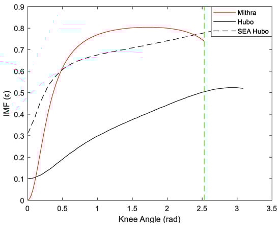 Impact mitigation factor in terms of the knee angle for Mithra in comparison with Hubo (with and without SEAs). The vertical green line corresponds to Mithra’s maximum knee flexion angle.