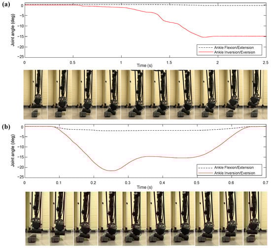 A less extreme case in interaction with irregular terrains occurs when the actuator is operating using low-gain impedance control. In this case, the actuator behaves similarly to a soft spring-damper, which allows it to adapt to the environment with some resistance. To investigate this behavior, a second experiment was conducted in which non-zero gains were applied to the closed-loop position controller for the inversion/eversion axis as well. As shown in Figure 16b, the joint encoder data and corresponding snapshots illustrate that the ankle adapted to the uneven surface when the foot made contact with the ground, and then returned to its commanded joint angle (zero degrees) when the leg was lifted. Together, these two experiments highlight the backdrivability of Mithra’s ankle joint in enabling the foot to conform to uneven terrain and respond compliantly to external disturbances, rather than rigidly resisting them.