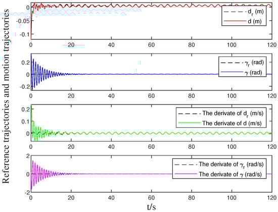 The system experiences external disturbances represented as . Based on this configuration, the trajectory tracking error dynamics in Equation (16) are characterized by the following system matrices: