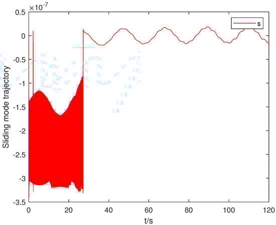The evaluation methodology focuses on three key performance indicators: trajectory tracking accuracy, convergence time characteristics, and robustness against actuator impairments. The following analysis examines both transient and steady-state behavior of the controlled system under the proposed adaptive parameter estimation and bounded-time control framework. The simulation results illustrated in Figure 1 and Figure 2 demonstrate the system’s tracking error and motion trajectory dynamics, respectively. These results confirm that our proposed methodology successfully confines tracking errors within a bounded region during a predetermined timeframe, even under bias actuator dynamics. Figure 3 illustrates the dynamic behavior of the integrated sliding surface, which initializes near zero and ultimately stabilizes within a minimal error margin around zero, validating our theoretical analysis.
