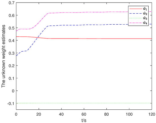 For the simulation, we initialize the trajectory tracking error as . The bias actuator dynamics is modeled as , which we approximate using an RBF neural network. The unknown ideal weight vector corresponding to this structure is assumed to be for simulation purposes in formulation (11).
