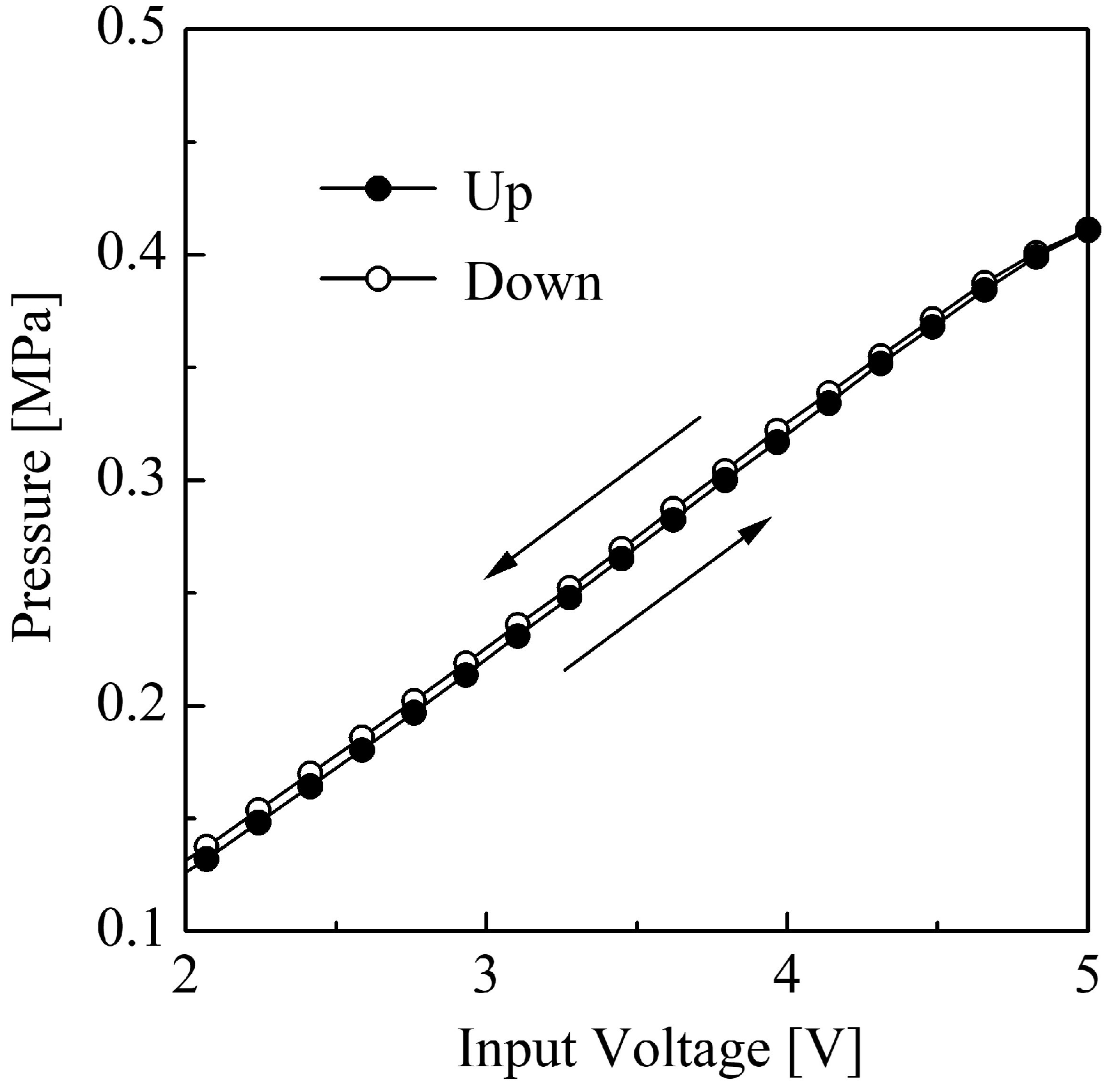 Figure 4 illustrates the pressure response within the cylinder when a step input voltage is applied to the power amplifier of an electro-pneumatic proportional pressure-control valve. This measurement was obtained by fixing one end of the cylinder and changing the input voltage from 5 V to 6 V (corresponding to a change in the secondary pressure from