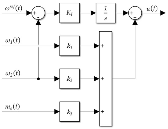 Utilising SFC in two-mass drives is a prevalent conventional solution, as this method allows for the analytical placements of all the poles of the system. It is important to note that the arbitrary determination of the poles requires that the system is fully controllable, and the values of all the required state variables are known, either through measurement or estimation. The proposed controller structure is presented in Figure 3. It comprises feedback loops from both the speed of the motor and the load, as well as the torsional torque: