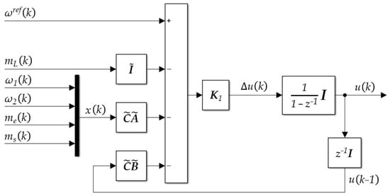 The matrix represents a least-squares solution and is computed using the dynamic matrix , which encapsulates the system’s response to control inputs over the prediction horizon. As such, inherently reflects the underlying system dynamics and provides the optimal control signal gains. The inclusion of the scalar gain coefficient enables the tuning of the control law, determining how strongly the controller reacts to predicted output errors. The algorithm used to calculate the above matrices for the purposes of this study is presented in Appendix A, and the block diagram is shown in Figure 4.