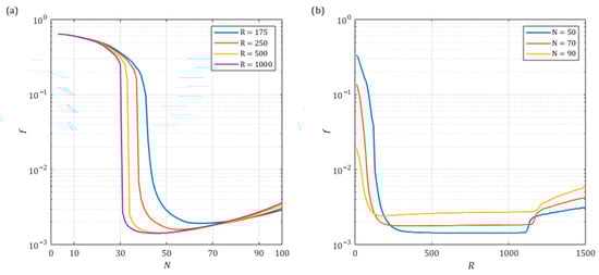 Performance function f depending on the aMPC parameters: (a) prediction horizon ; (b) gain coefficient .