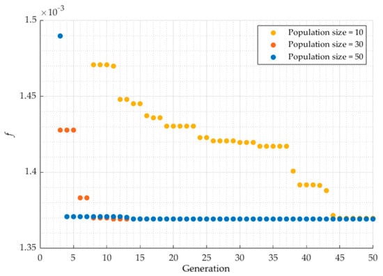 aMPC performance function value in successive generations of GA optimisation for different population sizes.