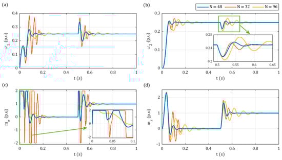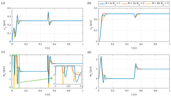In addition to the transients obtained with the use of the GA, the results for two additional lengths of are presented; notably, the lowest value for which the system is stable () and twice the original length (). As previously mentioned, with the shorter prediction horizon , the oscillatory character of the motor speed is enhanced by up to 45% during load application (Figure 8a), which can also be reflected in the load speed (Figure 8b). In contrast, a significant increase of facilitates smoother torque control (Figure 8c) at the expense of significantly longer transition processes, in this case almost tripling its duration.