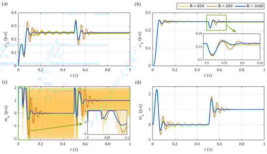 The simulation results depending on the gain coefficient are presented in Figure 9. The parameters have been selected to outline the effects that occur in the instances of both too low () and too high () gain values, as demonstrated in Figure 6b. For very low values of , the system dynamics are insufficient, leading to approximately twice-as-strong oscillations of the torque and, consequently, an almost 50% stronger motor speed. A further decrease causes increasingly volatile torque oscillations and ultimately the loss of stability. On the opposite end, extremely high gain values cause the controller to operate in saturation, resulting in continuous fluctuations up to the maximal torque (Figure 9c). In addition to the oscillations in the speed of both machines, a 1.6% steady-state error in the load speed can be observed (Figure 9b).