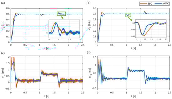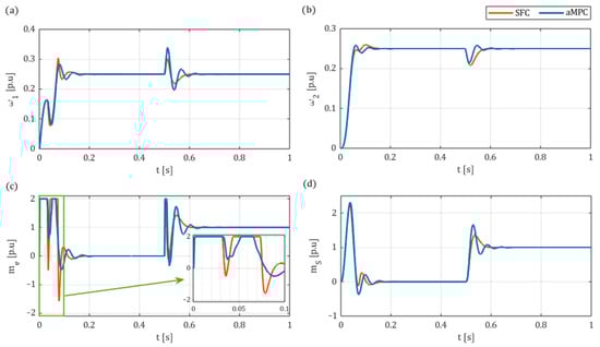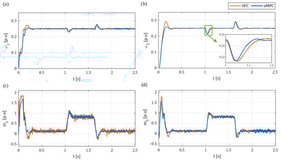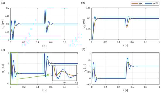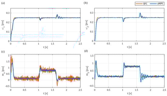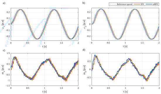 For comparison purposes, firstly the SFC model was tuned utilising the same GA method. The objective of the tuning process was to replicate the dynamics obtained for the aMPC-based system. Below in Figure 11 and Figure 12 are the simulation results for the obtained SFC parameters: and . As can be seen, both of the considered controllers are able to successfully reduce the effect of the torsional vibrations on the dynamics of the system. The step responses of the load speed are characterised by a virtually equal rate of increase. Additionally, the performance function of both control systems is nearly equal, at = 1.4209 × 10−3 for SFC and = 1.4197 × 10−3 for aMPC. Still, slightly smoother torque transients and a shorter transition process after introducing the load torque can be observed for aMPC.
