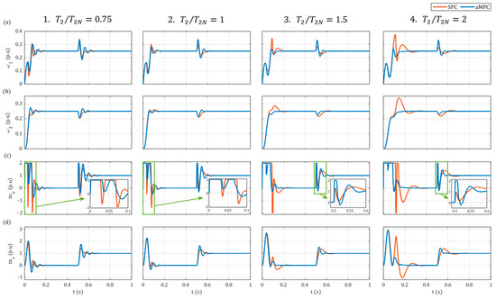 A comparison of these time delays with those noted in Figure 20 further highlights the superior robustness of aMPC. Under nominal parameters, aMPC achieved a phase difference approximately 40% lower than that of SFC. Following the increase in , aMPC exhibited a more than 50% smaller phase difference than that observed with SFC.