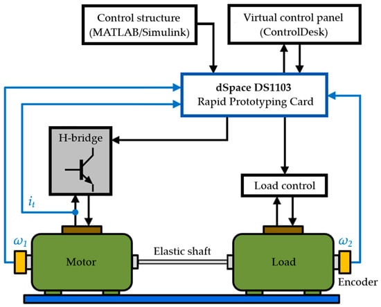 Figure 17 illustrates the control structure within the MATLAB/Simulink environment. Input signals from the dSpace DS1103 card and the virtual control panel are introduced using blocks from the Real-Time Interface (RTI) custom library. Following the scaling and normalisation into the per-unit system, the structure is analogous to that shown in Figure 5. Although the speed of both motors can be measured on the laboratory setup, this is not always feasible under practical implementation conditions. Consequently, the only measured values are the encoder signal and the current signal of the driving motor.