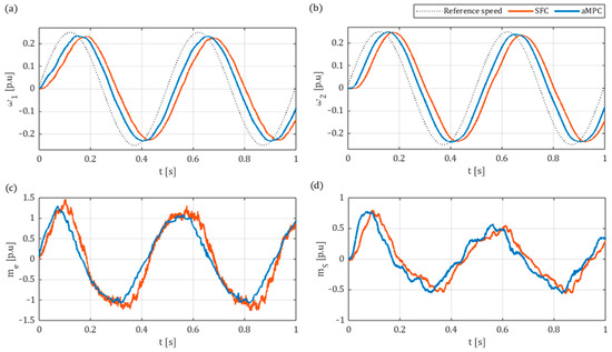 In Figure 20, comparative experimental results for sine wave tracking are showcased. In this case, it is evident from the electromagnetic torque trajectories (Figure 20c) that the initial system response was quicker in the case of aMPC. This resulted in a delay between the reference and the load speed at around , whereas for SFC, it was notably longer, at (Figure 20b). Moreover, the SFC sinusoidal speed trajectory exhibited an amplitude of 89.9% of the reference and a phase difference of –37.9°, while for aMPC, a slightly higher gain of 93.3% of the reference amplitude and a much shorter phase lag of –21.5° were obtained. Nevertheless, both controllers were capable of achieving near-perfect sinusoidal speed trajectories. Similarly to previous tests, the torque transients for aMPC were distinguished by a lower degree of fluctuations.